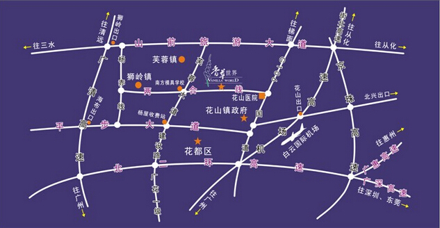 2.机场高速—往京珠、从化方向—花山出口出高速—106国道(从化、梯面方向)--花山医院转左直走2公里