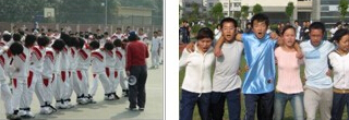 参加活动的队员排成一列横队,然后用布条将每两个相邻的人的腿绑上,